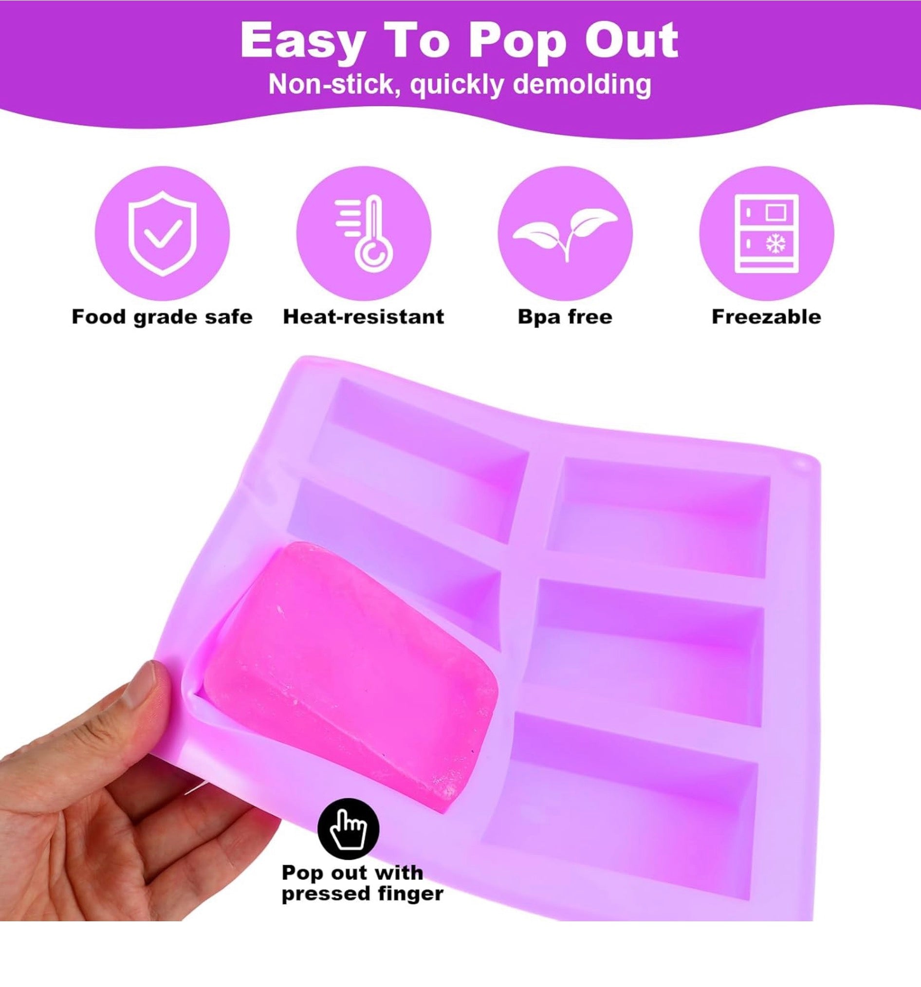 - Diseño versátil: estos moldes rectangulares de 6 cavidades son perfectos para una amplia gama de proyectos de bricolaje, incluyendo fabricación de jabón, hornear, manualidades de velas y moldeo de chocolate. Cada cavidad mide 3.2 x 2.2 x 0.96 pulgadas, proporcionando un amplio espacio para diseños creativos. Ya sea que estés haciendo jabones caseros, muffins, brownies o cubitos de hielo, estos moldes añaden un toque profesional a tus creaciones.